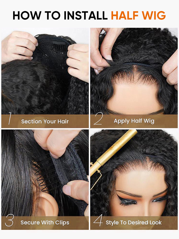 Half wigs come in several common styles. A U-part wig leaves a U-shaped section at the top of the head to expose natural hair, allowing it to blend seamlessly with the wig. The headband half wig is secured with a headband and can be put on quickly, making it ideal for beginners or those who prefer an easy option. The clip-in half wig attaches to the roots with small clips and is perfect for adding extra volume or length.